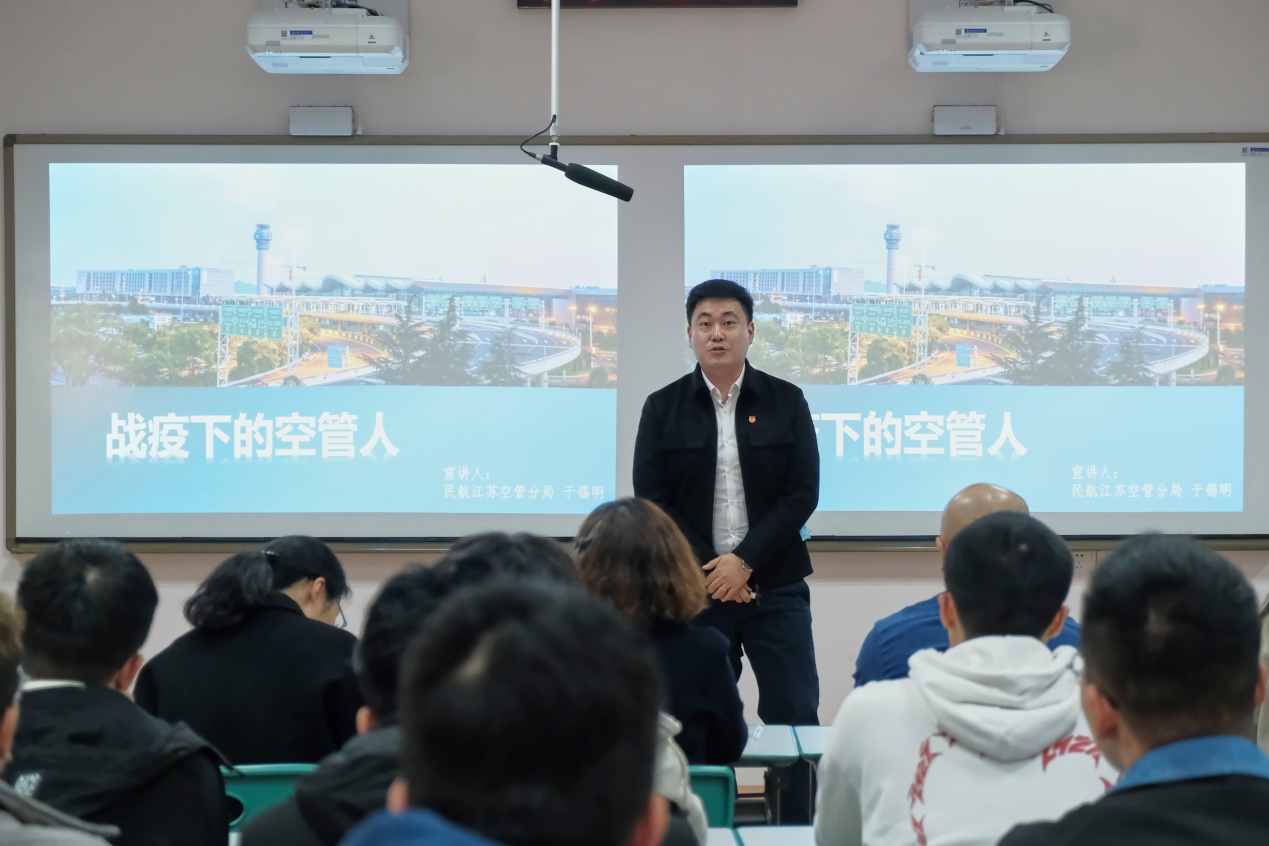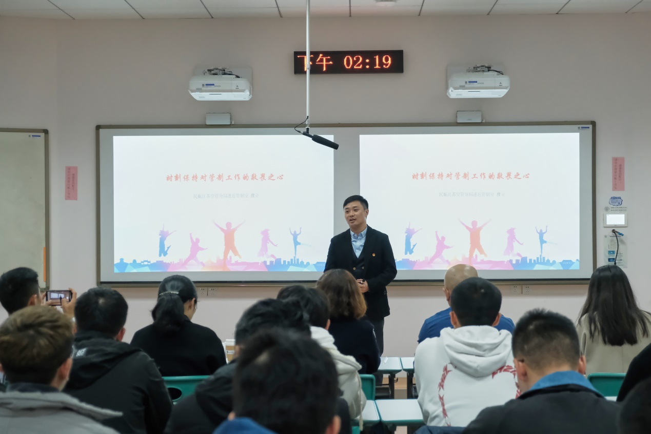 随后,华东空管局江苏空管分局进近管制室主任濮立讲述了自己从懵懂的见习管制员,成长为独挡一面的管制教员、检查员,最后走上基层领导岗位的奋斗历程。一路走来,他最大的感受就是:管制工作关乎人民生命财产安全,必须时刻保持对管制工作的敬畏之心。他给在座的学弟学妹提出了四个阶段性要求:一是在大学学习阶段,踏踏实实学好专业知识,为毕业季的三校联考以及日后从事管制岗位打下扎实的基础;二是在入职见习阶段,认认真真练好基本技能,将理论学习成果转化为实际操作;三是在放单成熟阶段,勤勤恳恳提高业务水平,戒骄戒躁,不断向着成为一名成熟管制员的目标努力;四是在持续发展阶段,兢兢业业提升综合能力,不断思考如何在更多领域为团队和单位做出贡献。