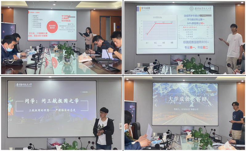 本次答辩共有8位同学参加,候选人从多方面、多视角对自己的事迹进行了分享。有多次参与导演并代表出镜央视、共青团中央等多个宣传片的文艺青年王思怡;有投身思想引领,入选江苏省青马工程“先锋骨干计划”的校学生会主席盛琪;有身兼多项学生干部、学业与科研并重的孺子牛黄潇;有在民航领域不断钻研,参与科研项目10余项科创达人李传家;有跨越文理、齐头并进,学科竞赛取得优异成绩的斜杠青年缪祺阳;有勤奋刻苦、大学四年平均绩点专业第一、深入一线参与支教的班长秦岩;有大四学年综测专业第一,主持省级创新训练项目的求知者阿都小军;有不忘初心、筑梦长空的基层团支部书记吴哲铭。各位候选人思想道德优异,综合成绩名列前茅,科研能力拔尖,富有开创探索精神,热心集体事务,勇于付出,乐于奉献,分别从学业、科创、学生工作、实践经历等方面对大学生涯进行回顾,总结了自己的收获与遗憾。