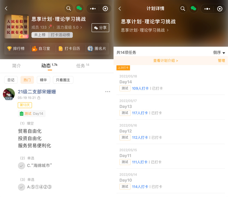 为认真贯彻落实习总书记关于党史学习教育的重要论述精神,营造良好的党史理论学习教育氛围,学习百年党史,汲取奋进力量,将红色基因融入血脉,种子搜索 组织各研究生党支部于2022年5月5日至18日推出“思享”计划·14天理论学习打卡活动,进一步提升党员们理论知识学习的主动性。