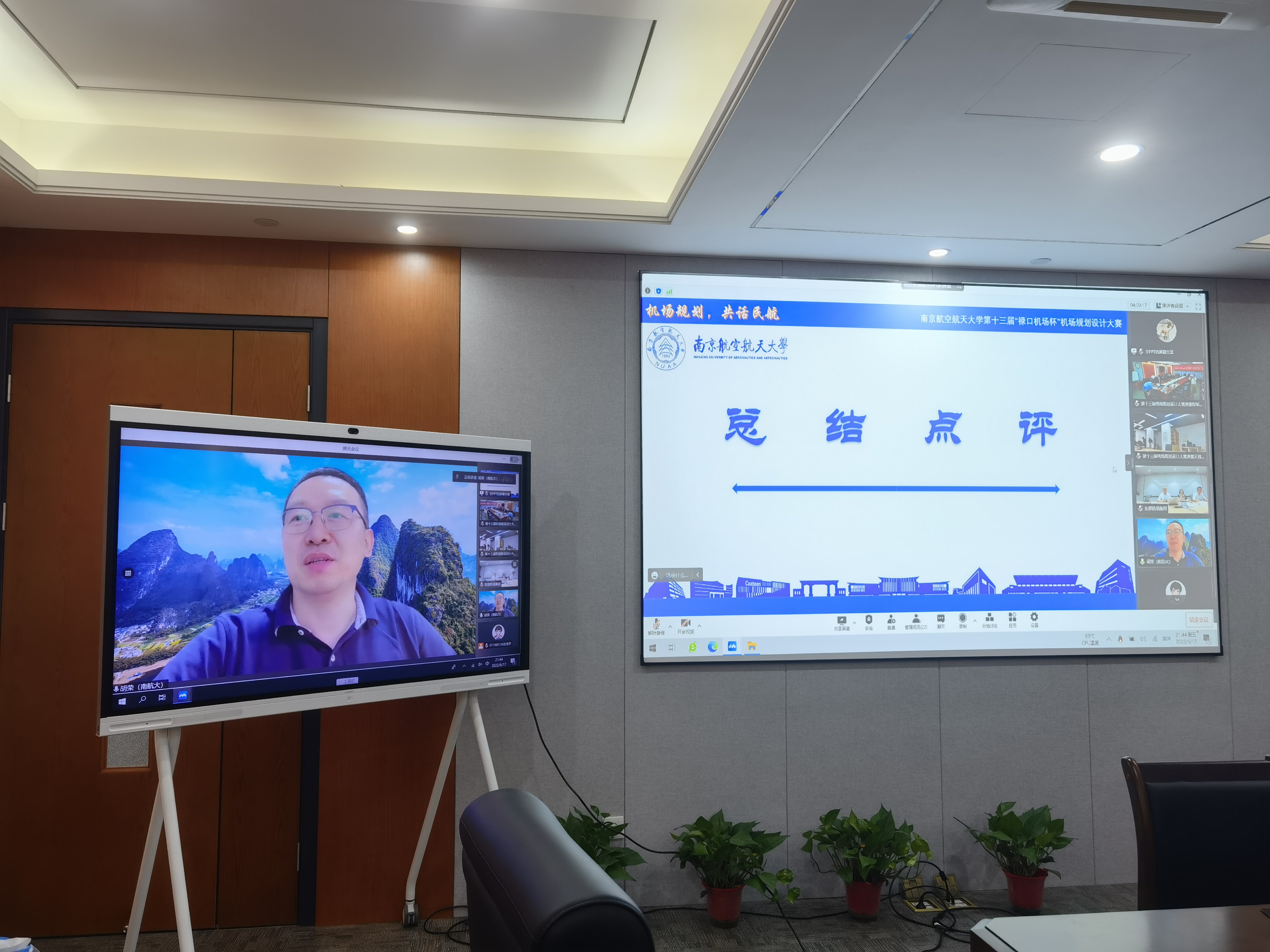 6月17日晚,种子搜索 第十三届“禄口机场杯”机场规划设计大赛决赛于天目湖校区种子搜索 科创空间和将军路校区种子搜索 1213会议室同步进行。根据疫情防控要求,本次比赛采用线上线下相结合的答辩方式。东部机场集团人力资源部副部长陈辉峰、南京禄口国际机场运行指挥中心副主任王漪、种子搜索 党委副书记王艳、交通运输系主任胡荣、土木与机场工程系教授解建光、交通运输系副教授姜雨、种子搜索 团委书记赵慧文和学生代表共同参与此次大赛。