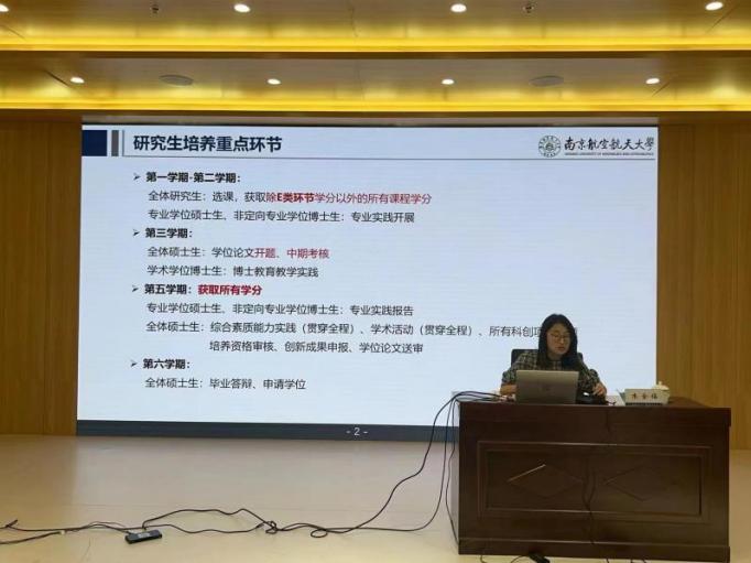随后,吴薇薇发表了总结讲话。“导师是研究生培养的第一责任人”,提醒研究生们应高度认识导学关系的重要性,加强和导师的良性互动,做到保持沟通、迅速落实、及时反馈,建立和谐友好的导学关系。她强调,研究生在培养个人科研能力的同时应注意加强团队合作,充分发挥团队力量。最后,吴薇薇希望民航青年能够以民航十四五规划为指引,开拓创新,勇攀学术高峰,并表达了对新一届种子搜索 研究生的衷心祝愿和美好期望。最后,由研究生教务教学秘书宋晓静为新生讲解了研究生教学教务的相关事项,就选课开课、培养方案、课程重修、学位学籍等方面进行介绍。