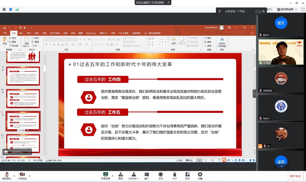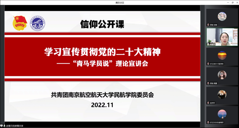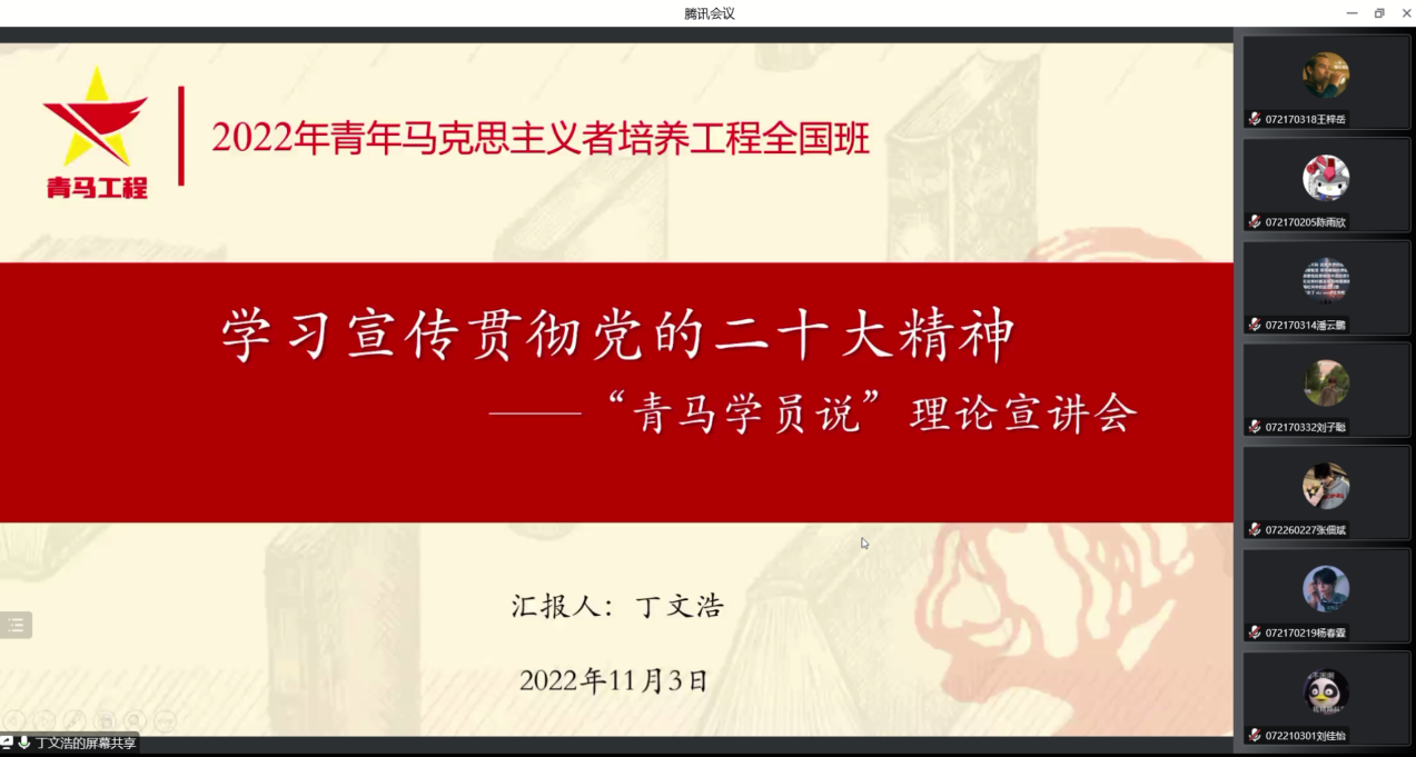 11月3日,种子搜索 举办青马公开课暨“青马学员说”理论宣讲会,专题学习党的二十大精神。全国青马工程高校班学员、种子搜索 硕士研究生丁文浩进行领学,种子搜索 天目湖校区全体团学骨干线上参与学习。本次活动由种子搜索 团委书记赵慧文主持。