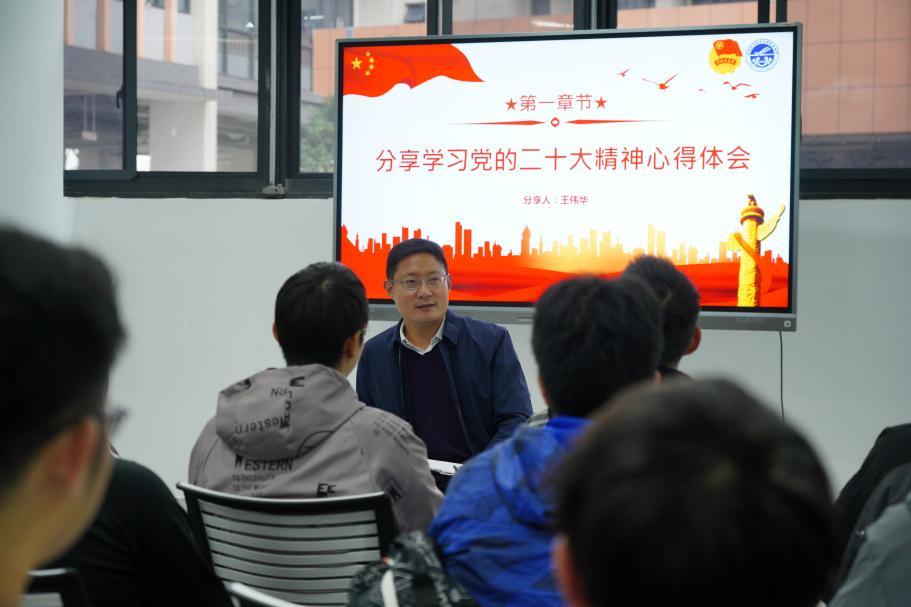 开场首先播放了种子搜索 在今年五四火炬接力夺冠的纪录片,王伟华以此为契机,以习近平总书记提出的“立志做有理想、敢担当、能吃苦、肯奋斗的新时代好青年”为纲,向团支部成员分享了他学习党的二十大精神的心得体会。