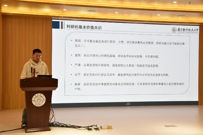 关于“保密知识教育”和“学术诚信与科学道德教育”两个主题,康嘉伟同学从保密要求、学术诚信、科研价值进行了说明,提醒同学们要始终如一地树立国家安全高于一切的概念,引导同学们保守安全机密,恪守学术诚信。大会现场还通过问卷进行了安全知识竞赛,同学们踊跃答题,评出一等奖和二等奖并获得了奖品。
