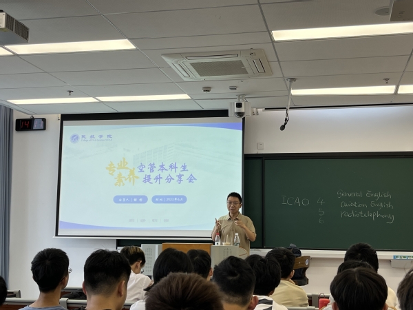 胡彬围绕英语重要性、英语如何学、大学英语学习规划等三个方面开展此次分享。首先,聚焦空管专业的特点,胡老师指出不论对本科就业从事管制、签派工作还是升学读研,英语的重要性不言而喻。他分享个人的英语学习经历与同学们进行交流互动,鼓励同学们勤学多练,养成良好的英语学习习惯,加强词汇的背诵和口语的表达,通过制定学习目标、做好学习规划、落实学习计划,在阅读中积累、在积累中练习、在练习中提升,积极参加相关的学科竞赛和考证考试,努力提高自身的英语语言运用能力。最后,胡老师针对同学们关于英语学习和专业发展的疑问和困惑结合自身学习工作经验做一一解答。此次分享让同学们对于大学英语的学习有了更清晰的认识和更全面的了解,对于有效规划大学英语的学习更有信心、更有动力,同时进一步拓宽了专业视野、培育了行业情怀。