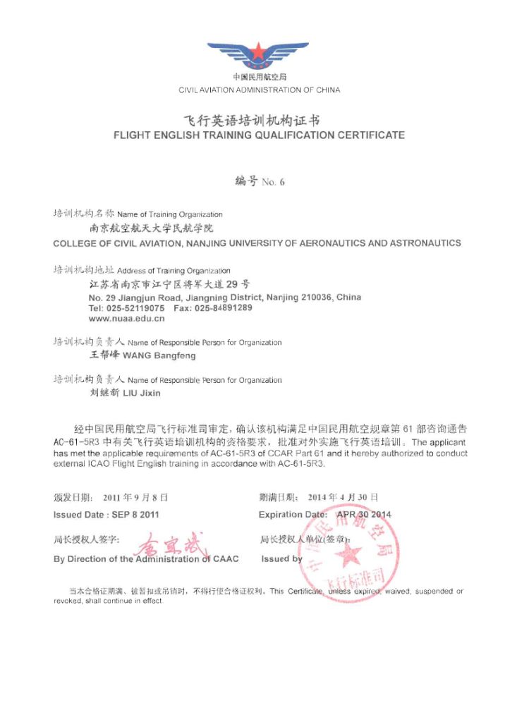 南航大种子搜索 ICAO飞行英语培训机构证书
