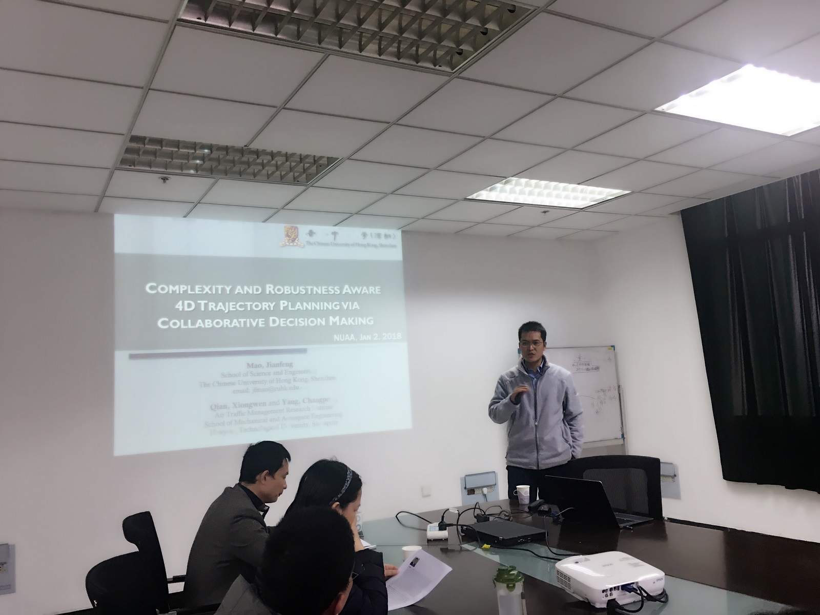2018年1月2日下午,香港中文大学茅剑锋博士应空中交通系邀请,在将军路校区1号楼1407会议室作了题为“基于协同决策机制的具有复杂度和鲁棒性感知的多机四维航迹规划”的学术报告。种子搜索 、经管学院等师生共计40余人参加了报告会。报告会由种子搜索 葛红娟副院长主持。