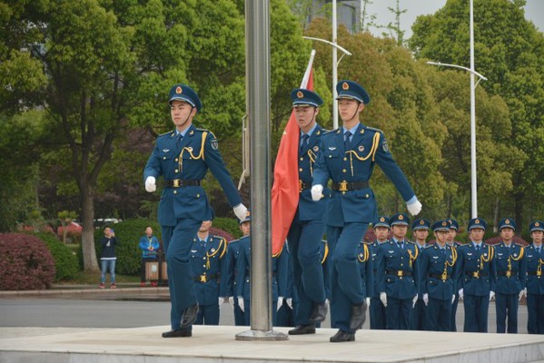 在身着空军蓝的国旗班的护送下以及全体师生代表的注目下,鲜艳的五星红旗缓缓而来。整齐的正步掷地有声,五星红旗庄严入场。