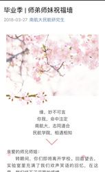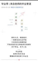 研究生三年的学习生涯中,每一步前行都离不开老师的引领与指导,每一份师生情都是最值得珍藏的记忆。毕业季,学院以师生情为主题开展了“毕业联播”系列活动,活动涵盖“来自老师的毕业寄语”、“毕业感言集锦”、“毕业祝福墙”三个子活动,通过语言文字、视频,记录毕业生们在种子搜索 三年研途生活的点滴过往。“来自老师的毕业寄语”活动,邀请各专业老师对即将毕业的2018届研究生们书写毕业寄语,劝勉毕业生在未来的人生道路上不畏失败、敢于拼搏。“毕业感言集锦”活动,通过手写明信片的形式,记录每一位毕业生三年民航生活的研途感悟和对南航校园生活的不舍,表达毕业生们与民航师生三年朝夕相伴的师生情,民航情;“毕业祝福墙”活动,邀请研一、研二的同学们将心中想对毕业师兄师姐说的话录制成视频,分享与师兄师姐朝夕相处的感动,送上最暖的祝福,并将视频拼接成一面“毕业祝福墙”,为即将离别南航生活的毕业生们送上最真挚的祝福。