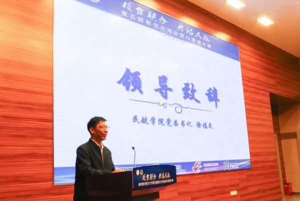 徐福民为本届大赛致辞,他对各航空公司的到来表达了诚挚的欢迎和由衷的谢意,希望各参赛队伍利用本次比赛的机会,提升专业知识,锻炼综合能力,也希望学院和各航空公司能有更深入、更广泛的合作。