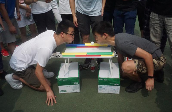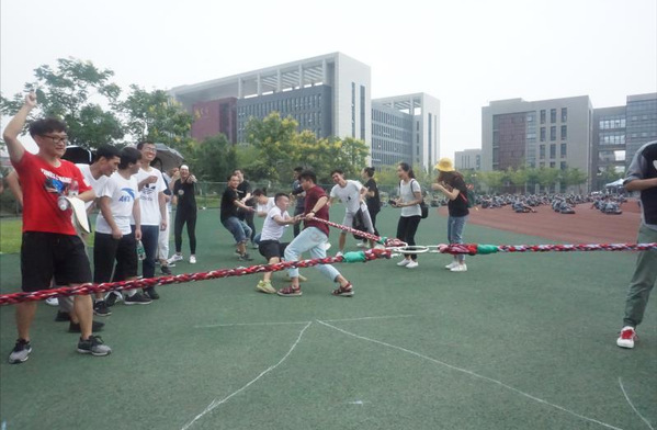 第三个比赛为“二人乒乓正面刚”,在一个小桌板上,队员展开了激烈的对决,狭路相逢,唯有勇者方能将球吹下对方桌岸。这场非常激烈的肺活量比赛,再一次将活动推向了高潮:掌声与喝彩声时时响起,不绝于耳。最后,是本次磨合活动最激烈的一轮比赛:三角拔河比赛,这个比赛不仅仅是一个拼体重的游戏,更考验同学们的团队合作能力,团队中每个人需要整齐发力、拉绳方向一致,在这场比赛中,同学们不仅从这场游戏中取得了欢乐,也加强了彼此的团队合作意识。