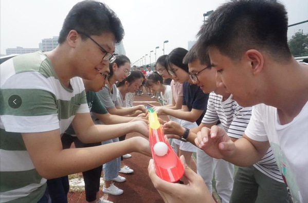 接下来,便是最具挑战性的乒乓球传递活动。作为团队游戏中的一道难关,在该项比赛中,每支队伍都需要精诚合作,方能取得胜利。此时,原本上一秒还有些生疏的新同学瞬间热闹起来,纷纷鼓足干劲,团结起来。展现出民航新生的团队意识和当代青年的青春活力。
