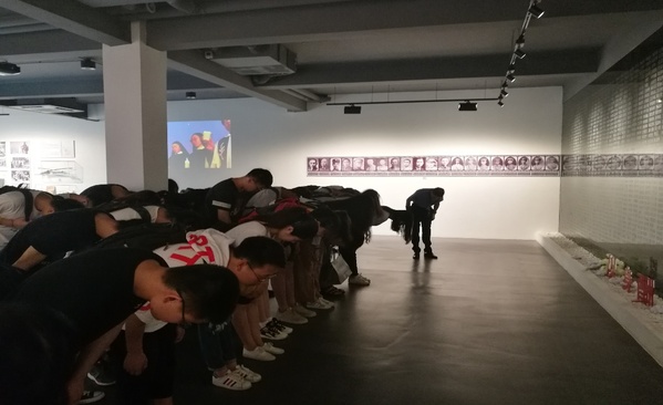 陈老师首先依次介绍了民间抗日时期的多件珍贵藏品,这些藏品都清晰地记录了侵华日军犯下的滔天暴行。随后,在抗战时期英勇牺牲的烈士名单前,陈老师提议向他们行礼,表达对他们的尊敬之情,在这面刻满了名字的铜墙上,都是南京保卫战中无所畏惧的战士,此时只能以感激和尊敬之情对他们表示衷心的敬佩!