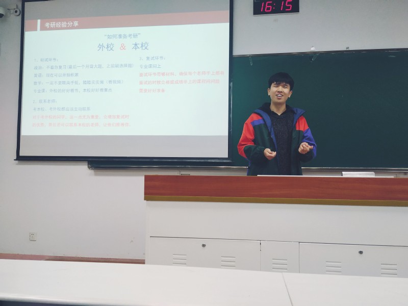 交流会第一个环节,是由唐琳学长、徐建升学长就自己保研和考研的经验,给予同学们中恳的建议。唐琳学长提醒大家一定要理性抉择,考研绝非易事;徐建升学长就自身保研经历,告诉同学们一定要注意知识的积累。随后两位学长对同学们对考研、保研仍然存在的困惑进行了细致的解答,同学们感觉受益良多。