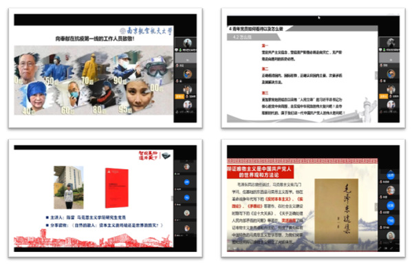 马克思主义学院党员陈雷从人与自然的关系角度切入,结合《自然的敌人》给大家分享了生态社会主义的相关内涵以及我国在这方面所做出的努力和成果。经济与管理学院辅导员康冲以辩证唯物主义是中国共产党人的世界观和方法论为主题,以“事物都是一分为二的”为切入点,从矛盾出发严谨分析了战“疫”中的矛盾现象,并结合阅读《毛泽东选集》的所思所感给大家讲述了党中央在疫情防控过程中为解决所遇到的矛盾点而精准施策的具体举措。