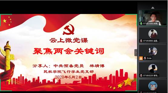 最后飞行学生党支部书记吴泊鋆老师做了点评,吴老师首先对四位同学带来的微党课表示肯定,其次也对两会内容进行了更深刻的讲解,从新时代的三大战役:疫情防控战、脱贫攻坚战、经济保卫战谈到到与我们近在咫尺的高校扩招政策。他说道,此次两会意义非凡,可以用“精彩”、“经典”、“惊艳”来形容。讲话的最后他将一句“让担当者担当,让履职者尽责。”送给大家勉励大家不断进步,展现自己的担当。